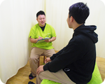 患者さまの症状・状態のチェックの為の問診をします。その後詳しく動きの確認や、痛めた部位、原因を突き止めます。